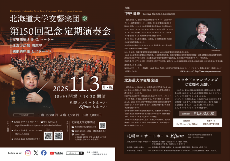 今回の記念演奏会は、150回という節目であると同時に、北大オケの未来へ向けて新たな一歩を踏み出す場でもあります。その舞台をより良いものにするために、皆さまのご支援を心からお願い申し上げます。