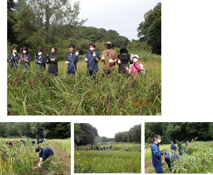 JRCとはJunior Red Crossの略称、日本赤十字社の組織の一つで青少年赤十字と言います。「気づき」「考え」行動する」という態度目標を掲げ地域や国際社会への貢献活動を展開しています。竹園高校のJRC部が里山での田んぼ作りに参加して今年で早8年目になります。今日は、顧問の先生、1,2年生6名、ALT2名が稲刈りに来てくれました。稲穂の垂れた黒米を刈り取り、束ねて竿に干す作業です。神奈川から参加したという小さなお子さん連れの家族と一緒になり、里山は久しぶりにぎやかでした。学生さん方は、普段、勉強に追われ自然と触れ合う機会が少ないため、里山に来ると気分がとてもリフレッシュできるそうです。また、無起耕、無農薬、無施肥の稲作りを体験して、カエルや昆虫と共存できる優しい農業の在り方に興味を持って学んでいます。収穫した古代米は6月の文化祭での販売にご協力を頂いています。若さ溢れる皆さんから「古民家再生、応援していま~す!」と、メッセージを頂きました。