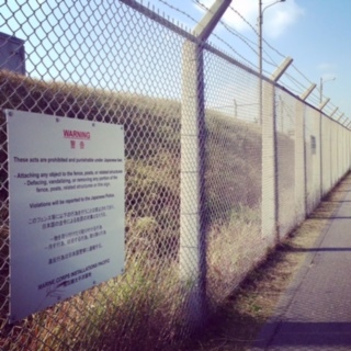 (辺野古のキャンプ・シュワブのフェンスに飾られた横断幕)