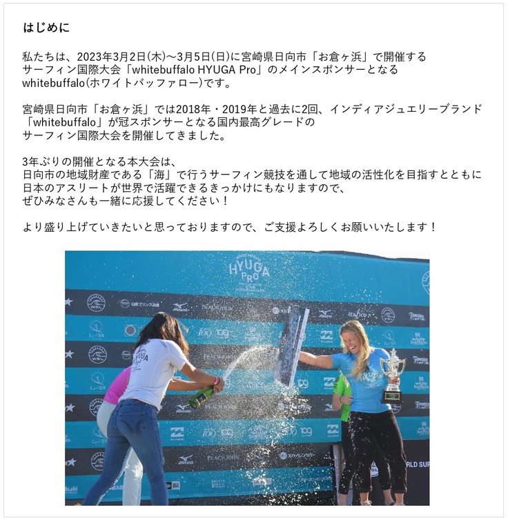 2023/3/1~5まで宮崎県日向市でサーフィン国際大会を開催します。集まった資金は大会運営費の一部に充てさせていただきます。