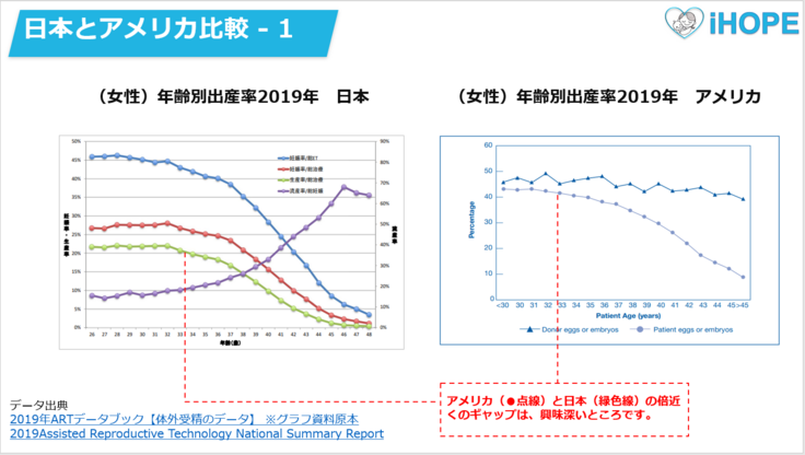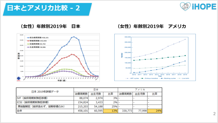 比較2、2019年ART周期に対する出生率、日本の13%に対して、アメリカは24%で1.8倍になっています。