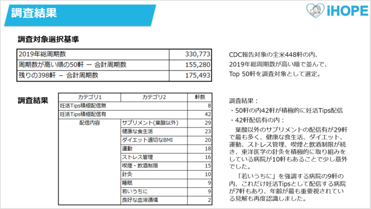 調査内容:積極的に妊活チップスの配信の有無、ある場合睡眠、運動、喫煙や飲酒の制限、ストレス管理、健康な食生活、ダイエット(適切なBMI)、良好な血液循環、サプリメント(葉酸以外)、若いうちに、整体(針灸等)の10項目