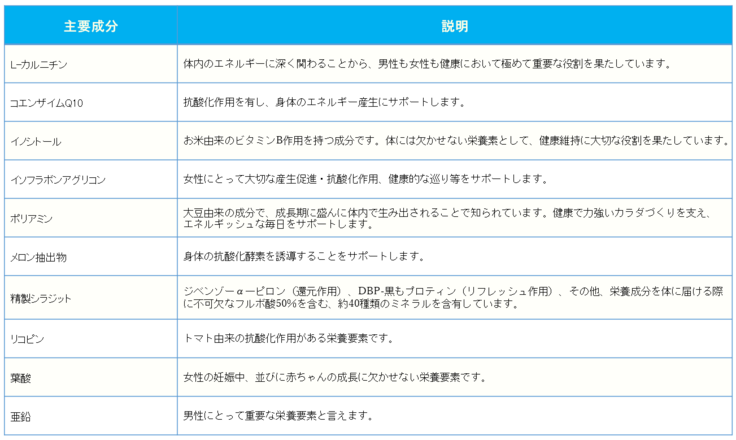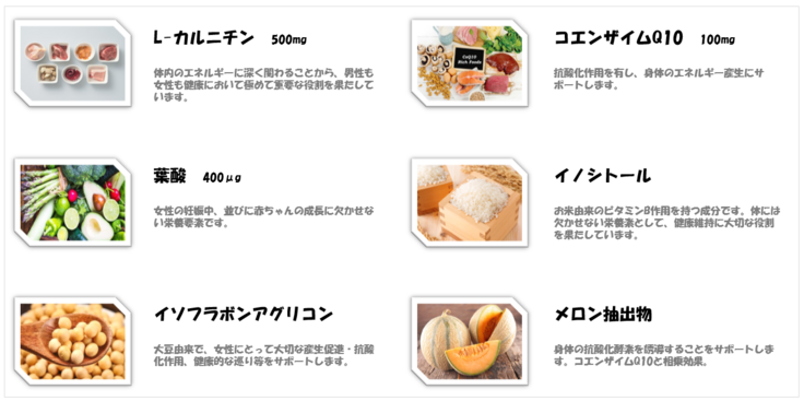 コエンザイムQ10[1]、ビタミンD[2]、イノシトール[3]、葉酸[4]、ビタミンC[5]、L-カルニチン[6]、亜鉛[8]、ビタミンB12[10]、鉄[11]、ビタミンA[12]、ビタミンE[13]