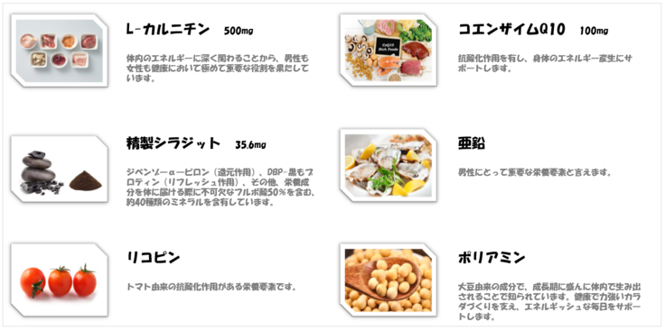 コエンザイムQ10[1]、ビタミンD[2]、イノシトール[3]、葉酸[4]、ビタミンC[5]、L-カルニチン[6]、シラジット[7]、亜鉛[8]、リコピン[9]、ビタミンB12[10]、鉄[11]、ビタミンE[13]、