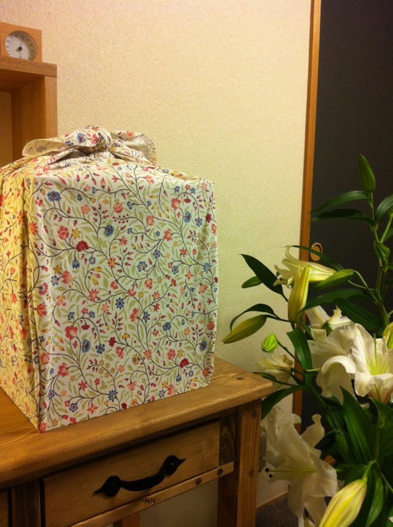 祖母の最後のカヴァーリング・ファッションは遺骨を包む風呂敷でした。愛用していたベッドカバーを裁断して使用しました。
