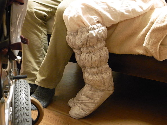 暖かい大判のひざかけが時々滑り落ちるからです。