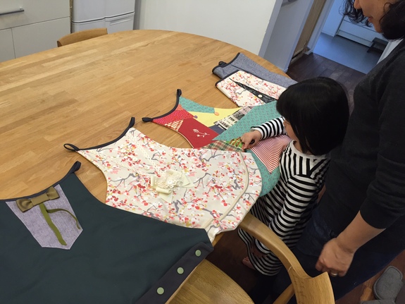 テーブルに並べたひざかけドレスをお母さんと見ていると、