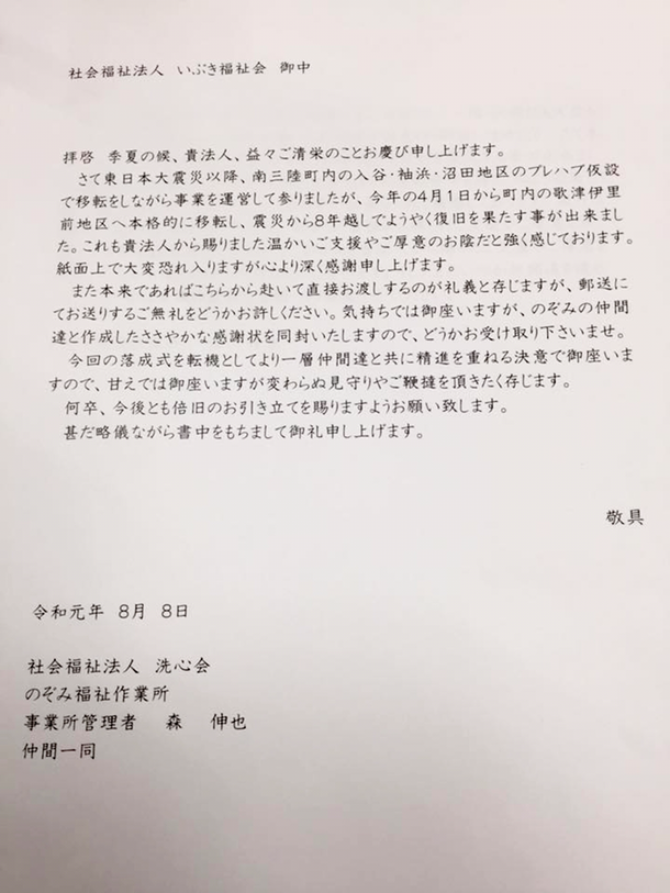 先日、のぞみ福祉作業所からお便りがとどきました。 (よろしければ写真拡大してご覧ください。 先方には了解いただいております) なんだか胸にこみ上げるものがありました。 同時に、未曾有の災害に立ち向かってこられた現地の方々に対して、 本当に私たちは感謝されるだけのことをしてきたのだろうかとも思いました。 どんなに「ありがとう」といわれても、 それは自分の心の問題なんだと思います。 むしろこうして伝え続けておられるのぞみの森伸也さんの姿勢を 本当に尊敬しています。 時間は遡れません。 だから、せめていま携わっている障害福祉の取組を通じて、 誰もが不安ではなく安心と希望をもてる、 寛容なお互いを認め合い助け合える社会を作ることに、 私ができることで頑張ろうと思いました。 パストラルいぶき第2期には災害時の避難所にもなる拠点を併設します。 南三陸から、大きなエールをいただいた気分です。 (Facebook「パストラルいぶき第2期プロジェクト」より。)