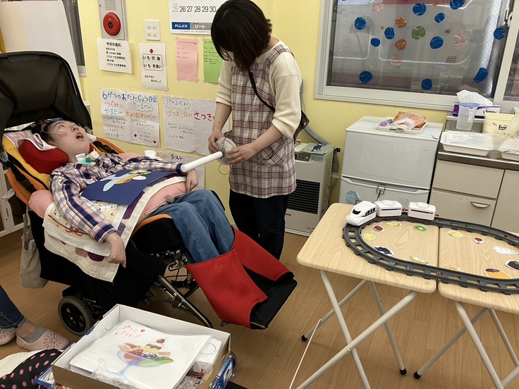 また同様に声を出すことができず、体を動かすことができない重症心身障害児のための放課後デイを7年前に始めました。開設当初は医療的ケアを必要とする放課後デイは札幌にはほとんどなく、小さなNPOが始める事業としては無謀だったかもしれませんが、その後市内にデイが急速に増えてきました。これまで私たちが意思伝達支援で培ってきたパソコン、iPad、スイッチなどの知識をデイで生かし、子どもたちの学びや遊びを支えています。