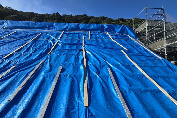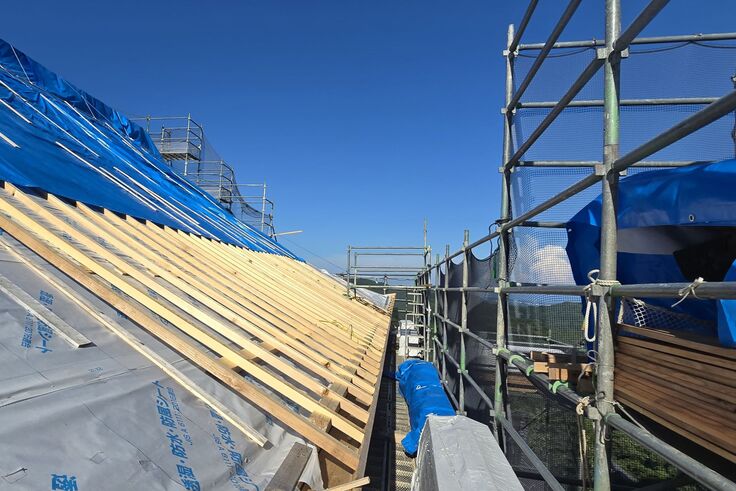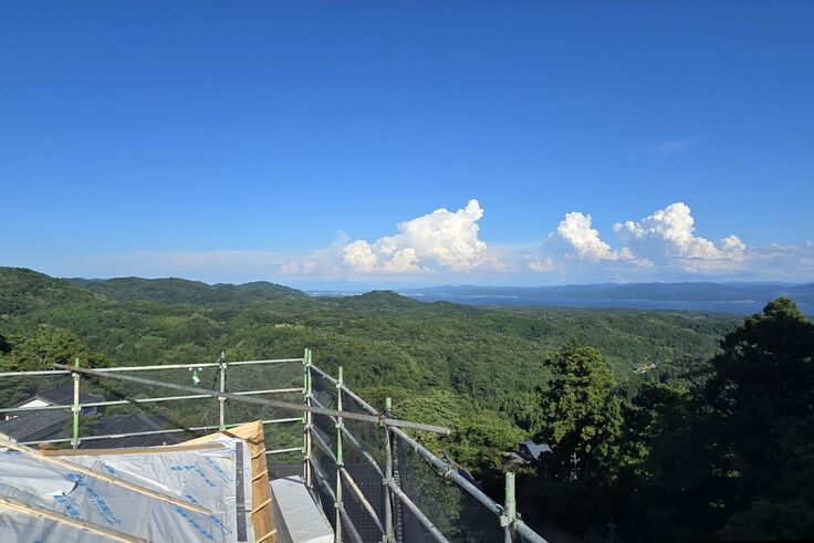 山形、秋田の方は豪雨の被害がご心配です。心よりお見舞いを申し上げます。出雲は7月21日に梅雨が明けて暑い日が続きます。時々、足場を上がり屋根の修復作業を見ています。建てられてから80年経ちますが、ほぼすべての箇所と言っていいほど、瓦と瓦の隙間や漆喰のはがれた後に、補修の跡が見受けられました。今は、その瓦はもちろん、瓦の下の土もすべて降ろされて、野地板の上に新たな防水処理をしながら、新しい木材でチタン屋根の下地を作る作業が進められています。雨の多い山陰地方の社寺の屋根替えは、ふつう「素屋根」(すやね)つけるんですが、この費用だけで数百万円がかかり工事費の負担になります。関東や東海地方の寺院の新築や修復工事では、ほとんど「素屋根」をつけないので、今回は業者さんとよく相談をして「素屋根」なしで作業をしていただいています。現場の方の日々の作業量は増えますが、費用を抑えることができるので有難いです。作業員さんは小さなバッテリーで小さな扇風機のついた作業着を来て、常に身体に風を送りながら炎天下での作業をされています。有難い限りです。熱中症に注意をしながら事故や怪我なく無事に進んでいくことを念じています。合掌