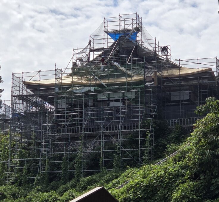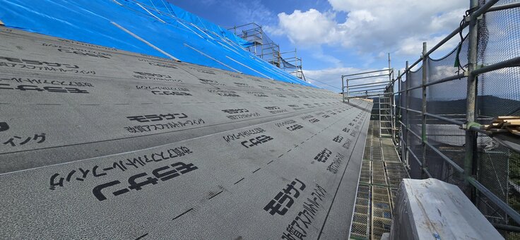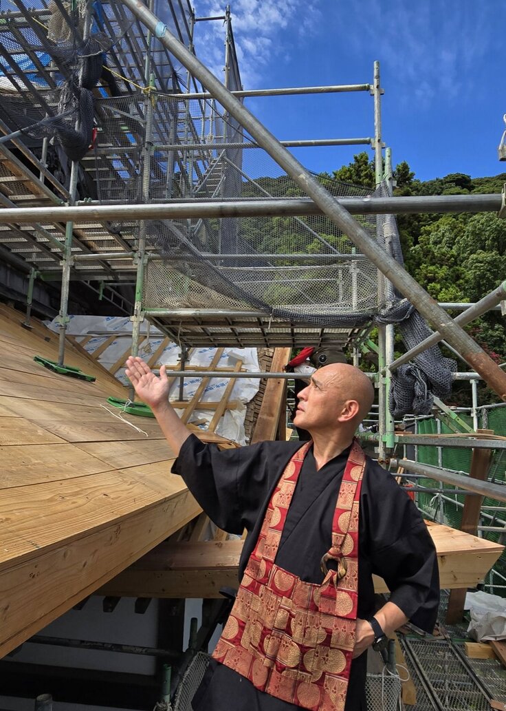 ご支援いただき有難うございます。大工さん方の作業中、足場の上に登ってみました。午後2時頃です。瓦屋根から金属屋根へ。下地を変更する作業が進んでいます。屋根のシルエットが徐々に変わってきました。二重目の防水シートが貼られています。出雲地方は明日から曇りマークが増えますが、今日まではずっと快晴続きでした。ヘルメットを瞬間取って記念撮影です。眺望はやはり天空だなと思いました。今日も下の御堂では学童クラブ80人の坐禅会がありました。来年は、この眺めの天空の瞑想体験が始められると思うとわくわくします。愈々来月からチタン貼りの工事に入ります。引き続きよろしくお願い申し上げます。
