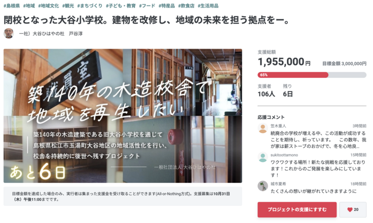 【あと5日】同県内のプロジェクト「閉校となった大谷小学校。建物を改修し、地域の未来を担う拠点をー。