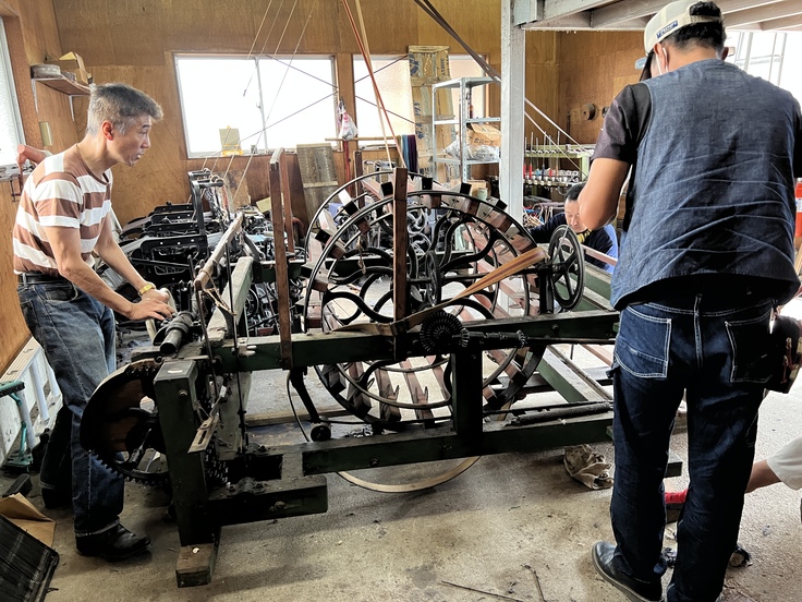 新しい移転場所に持って行く前に、糸巻き機や織機一つ一つに、モーターを取り付けます。まず機械工場に一度持って行かないといけないので、移転先に入れるまで、全部で3回ほど移動作業が必要になります。