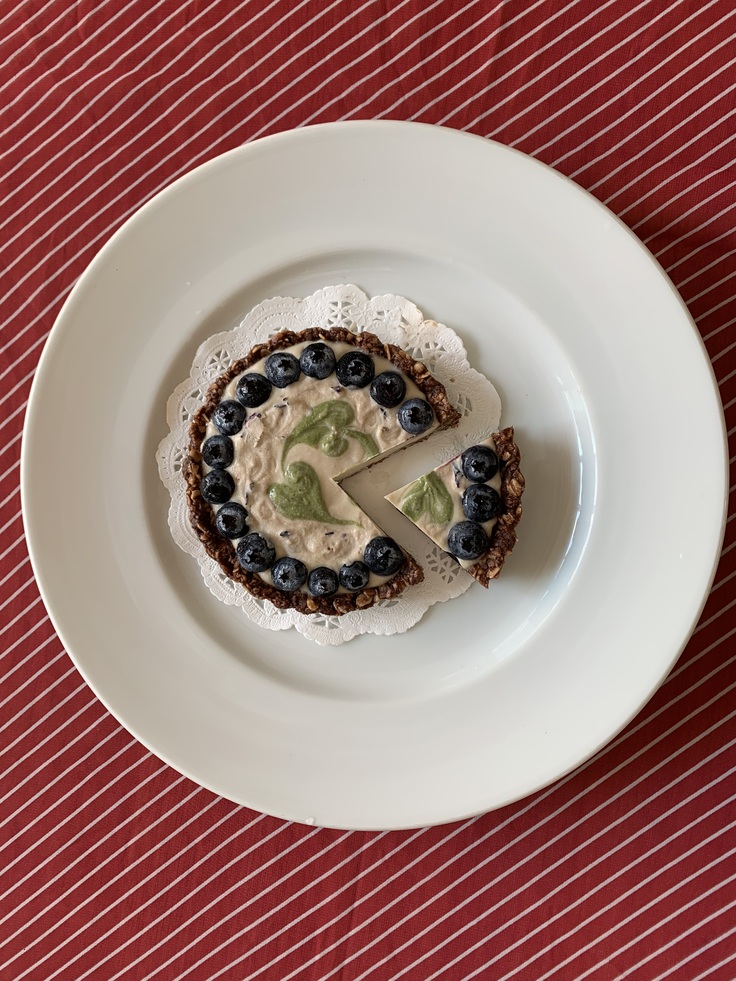 写真はわたしが作ったRaw Cakeです。ブルーベリーとカシューナッツをベースにカカオニブやモリンガといったスーパーフードも入っていて、人気のオートミールを使ったタルト生地です。