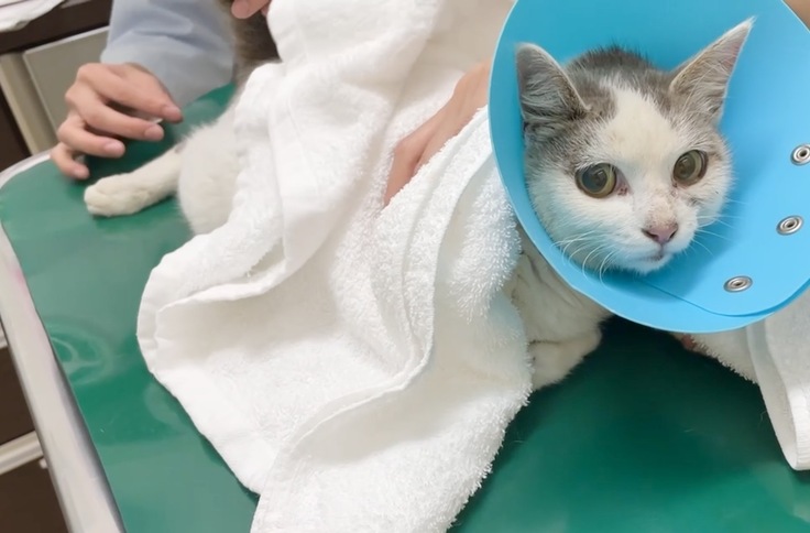 小鞠(こまり)は、2022年の10月に保護した子です。「交通事故で下半身を引きずる猫がいる」という連絡があり、保護に走りました。通院すると事故から日が経っていたのか、おしりからウジがたくさん出てきました。