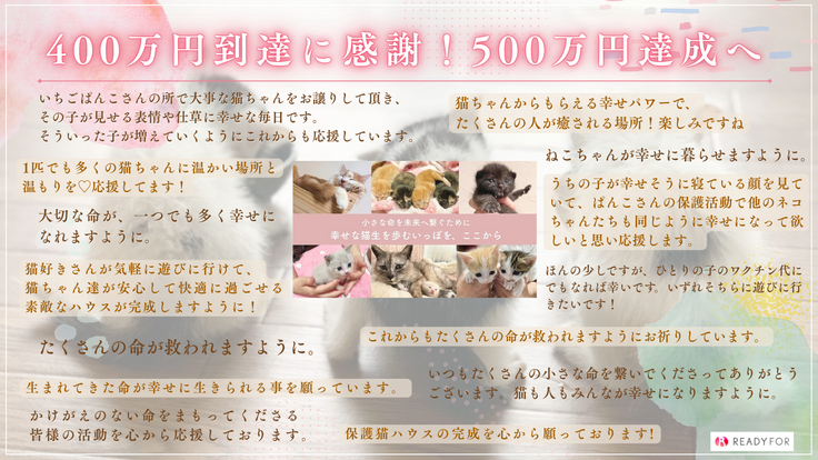 猫好きさんが気軽に遊びに行けて、猫ちゃん達が安心して快適に過ごせる素敵なハウスが完成しますように!応援してます。