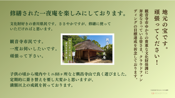 いつもあたたかいご支援、応援をありがとうございます。現在121%484万円のご支援をいただいております。心より感謝申し上げます。