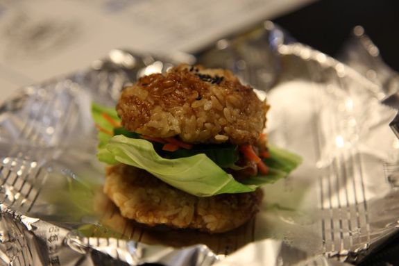 なまり節ラー油をまぶしたライスを焼いてバンズとし、お肉と野菜を挟みました。