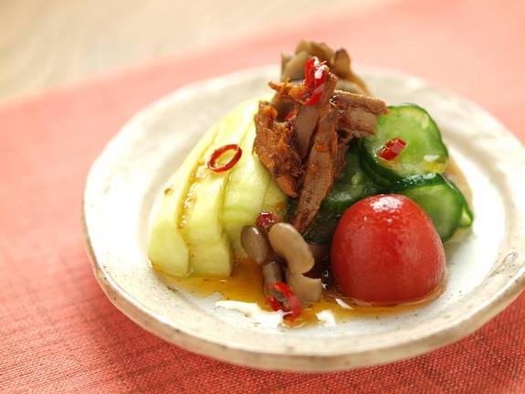 <蒸し茄子のなまり節ラー油かけ>