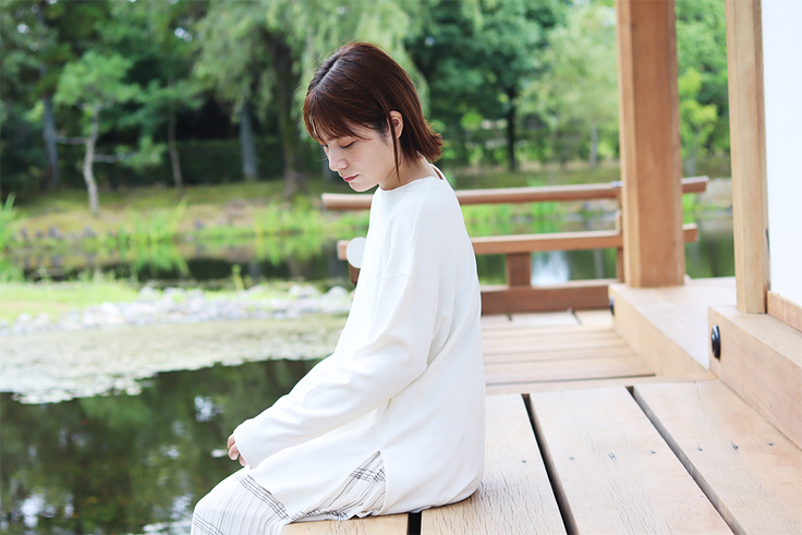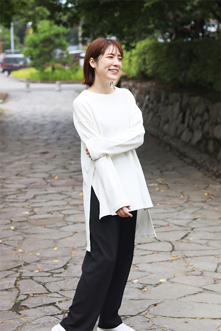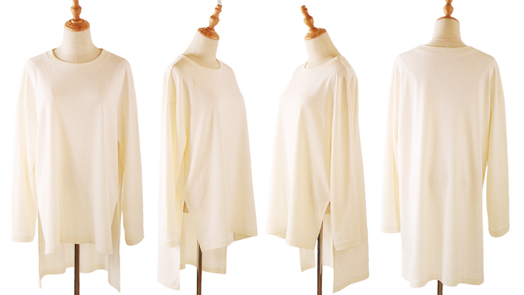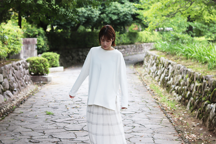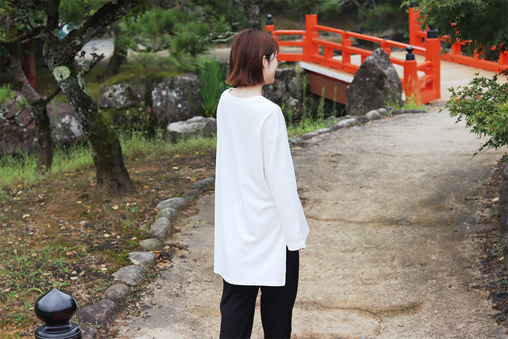 ゆったりとしたオーバーサイズのTシャツで脇のスリットが長めなのが特徴です。