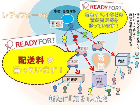 「絵本を贈ろう!プロジェクト」で絵本を贈る時の配送料と啓発イベントなどの宣伝費用等を募っています。(図参照)