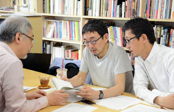 (編集会議の様子。左からアートディレクタ−佐藤直樹さん、編集ディレクター小崎哲哉さん、Think the Earth 上田壮一)