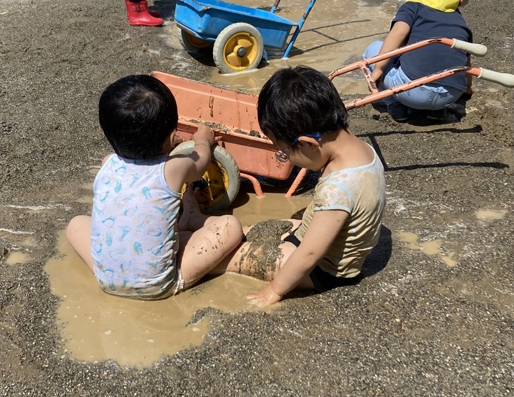 雨の後、水たまりが1番の遊び場です。泥をこねたり、素足で感触を楽しんだり、飛び跳ねて水を飛ばしたりと様々なことをしています。