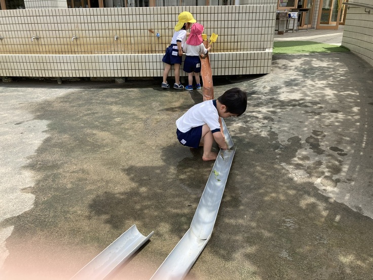 トヨを組み立て、水がスムーズに流れるように工夫したり、砂や葉などを流して楽しんでいます。
