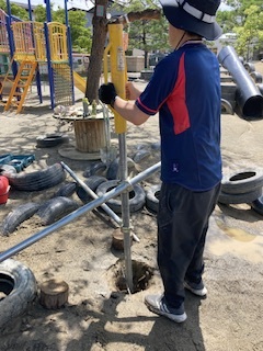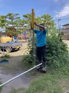 だきスコで掘り、単管を回したり、水を勢いよく入れて泥を吹き出したりしながら、打ち込みました。