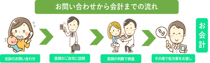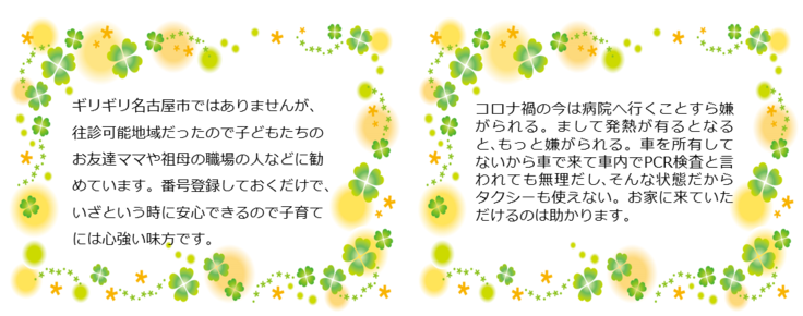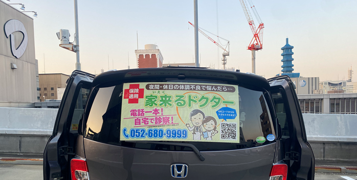 医療機関との連携により約50名の医師が登録(2021年3月現在)しており、夜間・休日の体調不良時に電話一本で適切な対処法をご案内いたします。名古屋市内全域・愛知県の一部地域をカバーしている往診エリア内で救急往診が必要と判断された場合、連携医療機関の医師が最短30分でご自宅へお伺いし診察を行います。必要に応じて、薬の処方もその場で行います。各種保険適用で、15歳未満のお子様はご加入の健康保険の助成制度により自己負担金はございません。医療証もお使いいただけます。