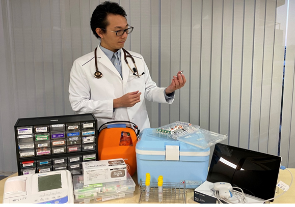 内科、外科症状も治療出来るよう120種類以上の処方薬を持参します。新型コロナウイルスなどの迅速検査、心電図、エコー検査なども可能です。
