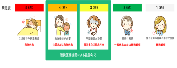 家来るドクターでは症状に応じた対処方法を連携医療機関の医師の判断のもとご案内いたします。緊急度判定プロトコルに基づいて赤(救急)・橙(準救急)・黄(準救急)・緑(低救急)・白(非救急)の5段階にわけて緊急性を連携医療機関の医師が判断(トリアージ)し、対処方法をご案内しております。連携医療機関に登録している医師の他に「家来るドクター」にはコールセンタースタッフ、医療事務、ドライバー等のスタッフが在籍しております。