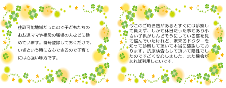 突然の発熱症状に対してかかりつけ医がなく「どこに相談すれば良いのかわからない」患者様や、発熱症状のため他の病院に診察を断られてしまった患者様、基礎疾患があり二次感染が心配で通院出来なかった患者様など、新型コロナウイルスによる影響で、あらゆる不安を抱えた患者様と向き合って来ました。このような状況だからこそ「家来るドクター」は患者様やそのご家族に寄り添い、地域医療の架け橋として走り続ける必要があります。