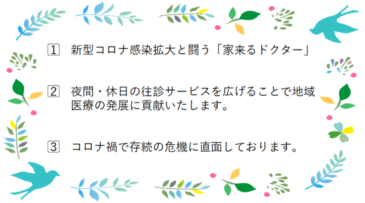 緊急事態宣言が解除された今でも、変異ウイルス感染拡大・迫りくる第4波・見通しが立たないワクチン接種など様々な不安の中で大変な毎日をお過ごしのことと思います。Withコロナ時代を見据えた新しい医療提供体制のあり方が求められる今、家来るドクターは、夜間休日の往診サービスを広める事が地域医療の充実に繋がると信じて邁進しております。そこで、一人でも多くの方の命を守るため、皆さまの力をお貸しいただけないでしょうか。