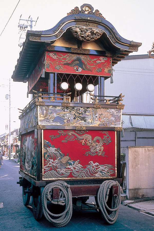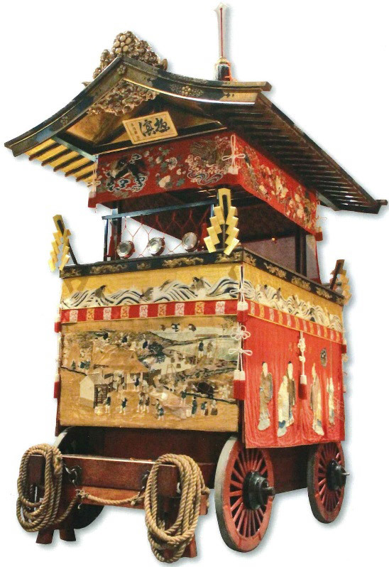 屋根は切破風で古い鉾車の形を良く伝えています。前後の化粧梁には向島町に居住した藤堂藩の儒者兼兵法家高見照陽の書による「深溟(たんめい)」「剪莽(せんぼう)」の扁額が掛けられています。暗がりを探り生い茂る草を刈るという開拓の精神を表しています。