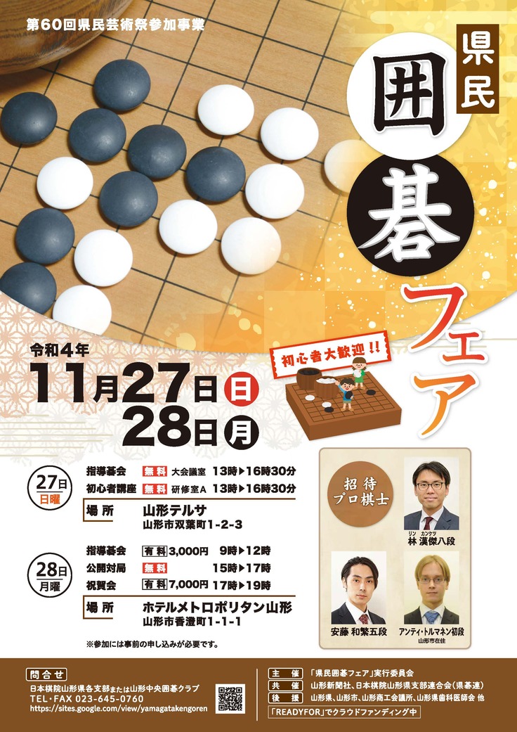 ・第1日目 11月27日(日)13:00~16:30 山形テルサ 大会議室(双葉町1-2-3) 約100人(指導碁会:無料) 11月27日(日)13:00~16:30 山形テルサ 研修室A(双葉町1-2-3) 約20人(初心者講座:無料)