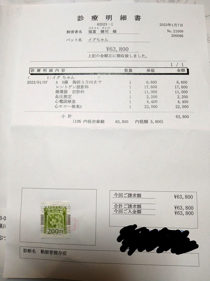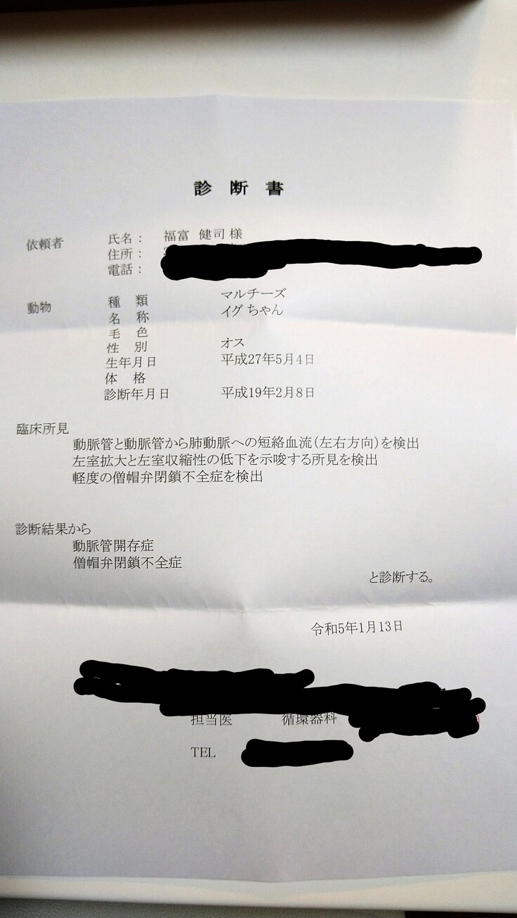 咳が出始めたので、心臓病が悪化しているのではと、近所の病院で超音波エコーで診てもらったところ、「動脈管開存症」の疑い。