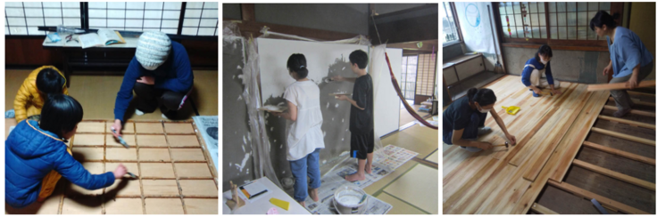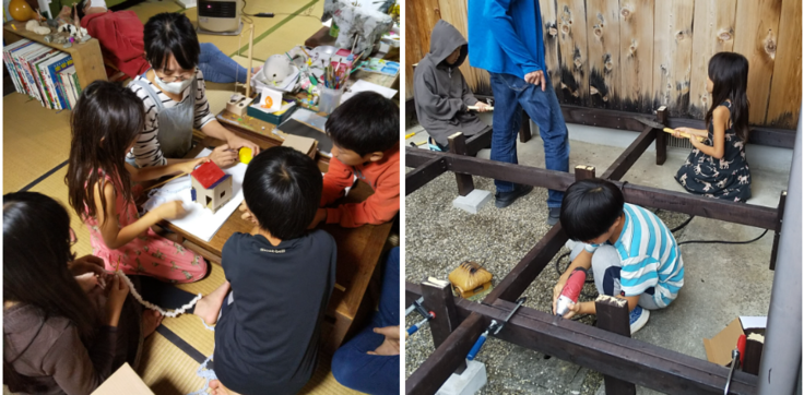 蓄積した汚れの大掃除、ふすまの張替え、母屋の壁のしっくい塗りや、ボロボロだった畳スペースの床貼りなど、地域の人たちの力を借りながらDIYで整え、2020年6月、娘ともう2人のこどもの計3名を迎えて、造形教室のフリースクール部門としてスタート。翌年には運営委員会を立ち上げ、任意団体「つくるがっこう イホルラ舎」として本格的に活動を始めました。