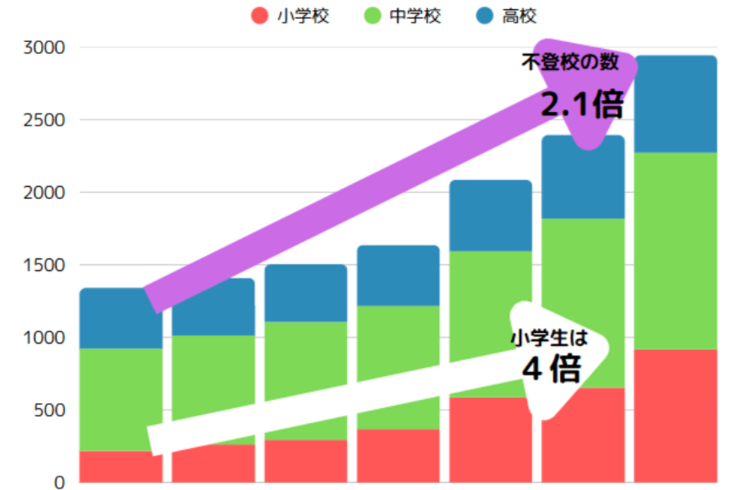 文科省の調査では、2023年度の不登校の児童生徒は全国で過去最多。和歌山県も例外ではなく、小中高ともに不登校の子どもが急増しており、小学生917人、中学生1355人と、過去最多の状況が続いています。特に小中学生の増加が特に顕著で、「小学生の不登校率」は6年で約4倍にもなっています。