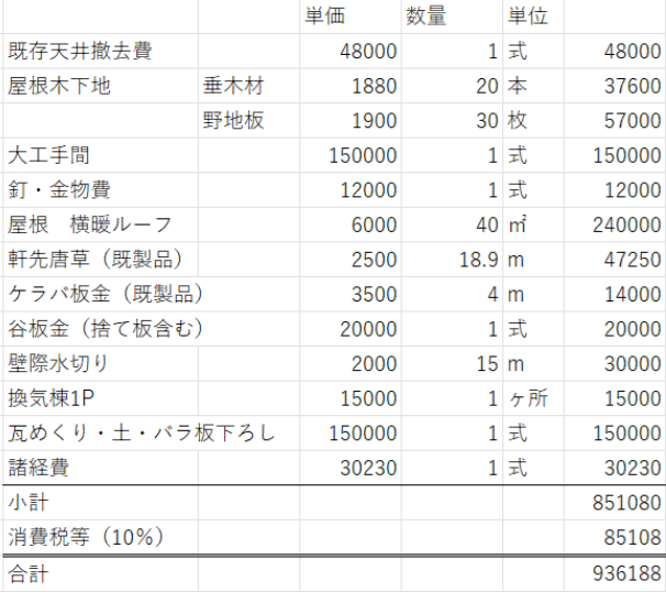 「はなれ」は今は使用していませんが、屋根や天井が今にも崩れそうな状態です。壁や床などは自分たちで整えるつもりですが、専門家から「屋根だけはプロがやらないと危険」とのアドバイスがあり、大工さんにお願いする材料・工事費用が必要です。