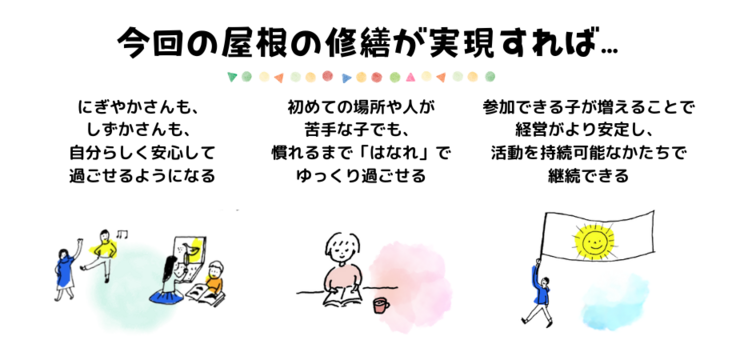 目標額を達成できた場合は、屋根の改修を速やかに進め、静かな環境を必要とするこどもたちに、安心して過ごせる空間を届けたいと考えています。
