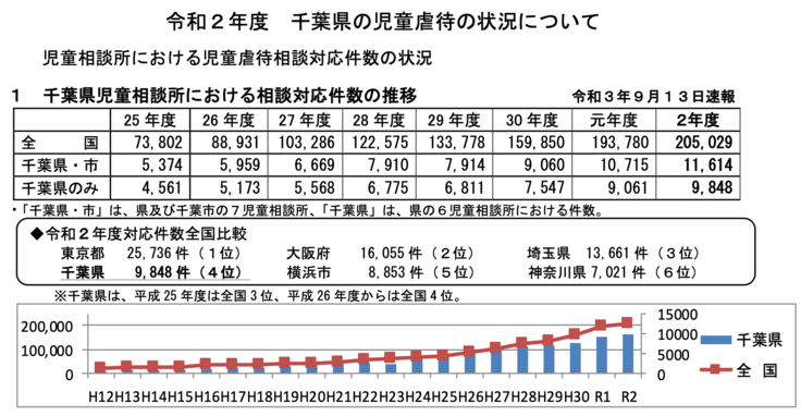 千葉県は、児童虐待に関する相談対応件数の多さで全国ワースト4位となっています。年間件数は、令和2年度では、1万1614件にものぼります。