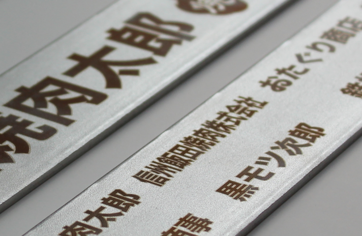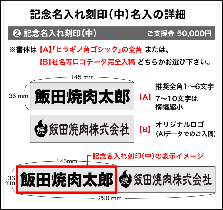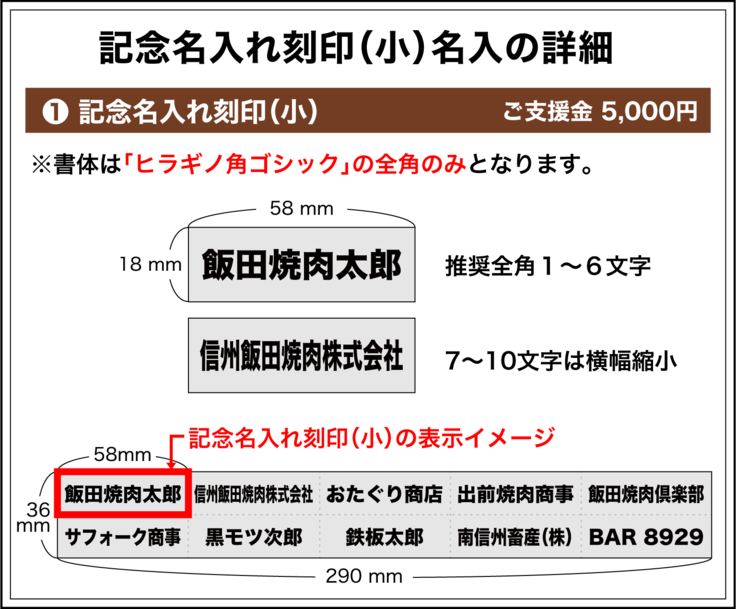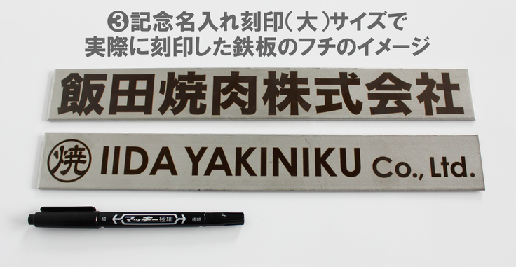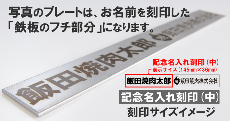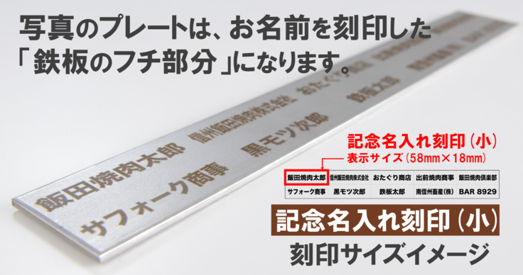 ご支援者様の希望する「お名前・店舗名・企業名等」を、上記のサイズで11.29mの焼肉用鉄板のフチに「黒文字・横書き」でレーザー刻印。