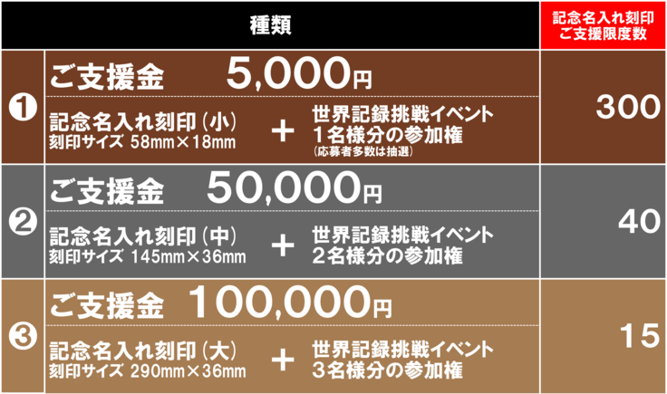 ※世界記録挑戦イベント参加権の詳細はご支援プランの最後にに記載しております。