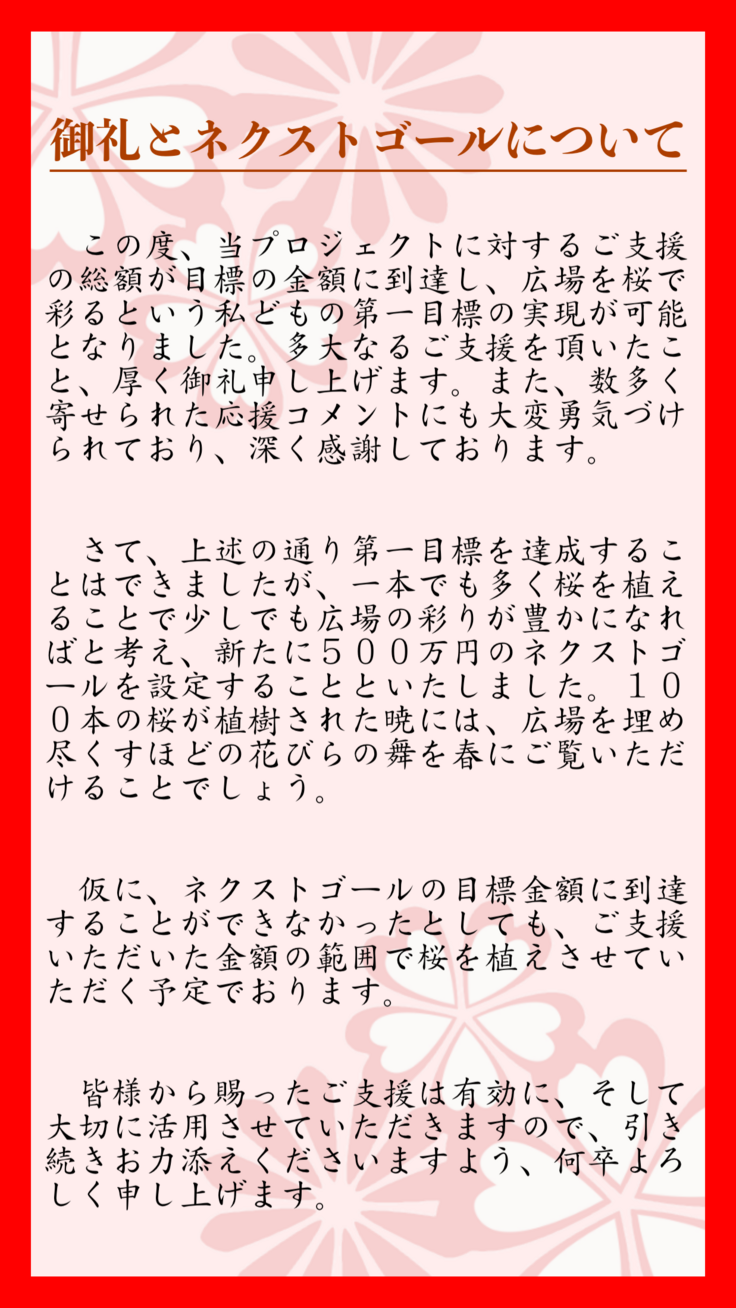 以上の桜広場に植える桜の購入費用や工事費用のために、1本あたり5万円、最大で100本分のご支援を賜りたく存じます。