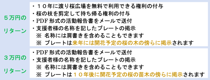5万円のリターンでは「来年には開花予定の桜の木」が対象となっており、3万円のリターンでは「10年後に開花予定の桜の苗木」が対象となっておりますので、ご注意ください。どちらのリターンであっても10年スパンでの計画となっておりますので、長期に渡って当プロジェクトへ関わっていただければ幸いです。