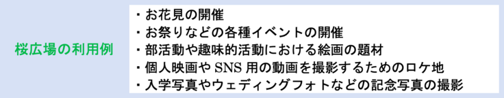 地域の方々に桜を楽しんでいただく場所を設けるために、以下のように多目的な利用を可能とする桜広場を作りたいと考えております。この桜広場の利用にあたっては、地域の方々に広くご利用していただきたいという趣旨から、利用料を桜広場の維持・管理に必要な程度の低廉な価格に設定したいと考えております。なお、桜の品種は染井吉野を予定しております。