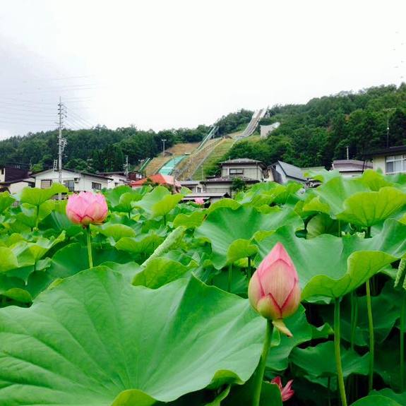 日本広しと言えど、スキーのジャンプ台と蓮の花が見える風景は珍しいのではないでしょうか。