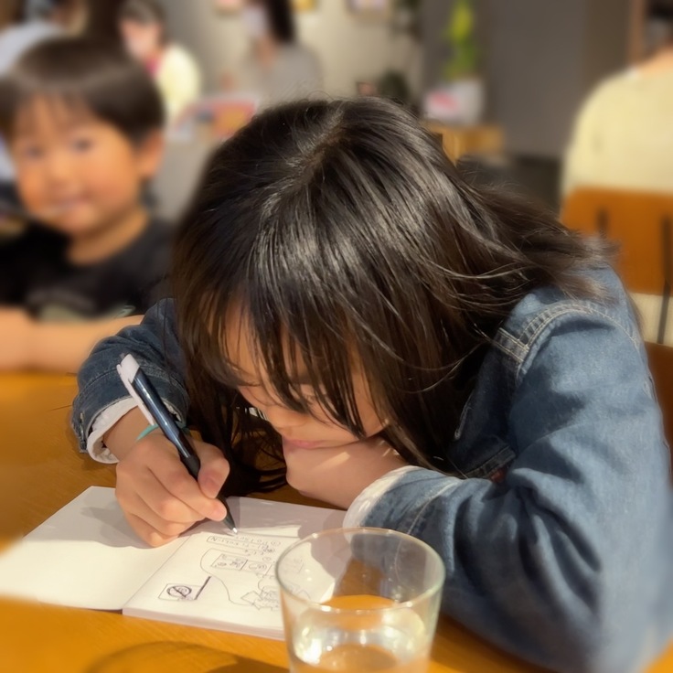 構想を話しながらの帰り道、momoさんの頭にはもう色々な絵が浮かんでいたようで、お疲れ様のランチを食べる大人たちを尻目に、もう、作画し始めていました。