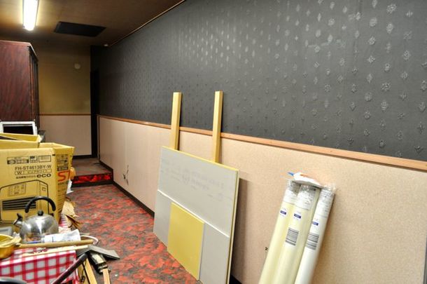 壁の上半分の黒いクロスは元のスナックのままですが、下半分は保健所の指導のもと、掃除がしやすく水を通さない素材のクロスを貼ります。